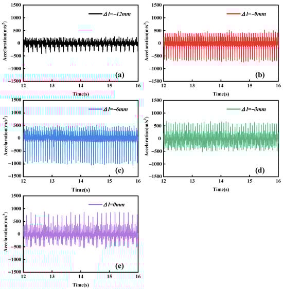 The acceleration signals at the midpoint of the screen plate under 5 different PSAs obtained in the experiment are shown in Figure 10. Figure 10a–e respectively illustrate the curves of the acceleration variation over time at the midpoint of the screen plate along the direction perpendicular to the screen plate under PSAs of −12 mm, −9 mm, −6 mm, −3 mm, and 0 mm.