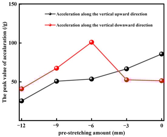 Based on the experimental data from Figure 10 and Figure 11, the following conclusions can be drawn: when the PSA is less than or equal to −6 mm (indicating the screen plate is fully relaxed during the stretching relaxation motion), the peak acceleration in the vertical upward direction is less than the peak acceleration in the vertical downward direction. On the other hand, when the PSA is greater than −6 mm (indicating the screen plate is being tightened during the motion), the peak acceleration in the vertical upward direction is greater than the peak acceleration in the vertical downward direction.