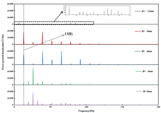 The power spectral density (PSD) of the acceleration signals of the screen plate with PSA of −3 mm and 0 mm both exhibit one peak, which corresponds to twice of external excitation frequency.