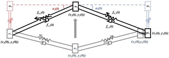 At time t, the nonlinear elastic forces and damping forces that connect the three mass blocks are decomposed into the x and y directions. The angle between the total elastic force of the ith spring at moment t and the elastic force decomposed into the x-direction is referred to as αi(t).