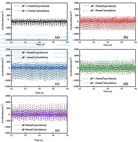 Figure 14a–e display the comparison between the experimental values and the calculated values of the acceleration time graph in the vertical direction of mass block m2 after being subjected to periodic excitation for different PSAs of the screen plate (∆l = −12 mm, −9 mm, −6 mm, −3 mm, 0 mm) in the non-linear spring-tri-body model.
