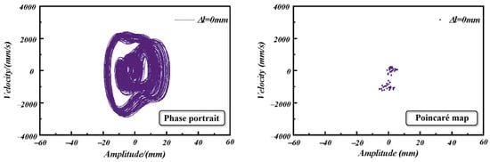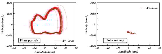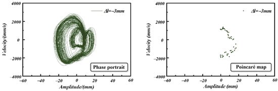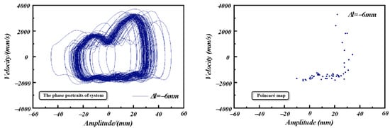 Under a PSA of −6 mm, although the phase trajectory is also composed of multiple overlapping loops, the disorderliness is the strongest compared to other conditions. In Figure 17, it can be observed in the phase diagram that the non-coincidence of the phase trajectory is higher. The Poincaré map exhibits a hierarchical scatter distribution pattern, indicating that the system is closer to a chaotic motion state under this condition.