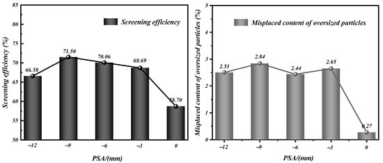 According to Figure 20, as the PSA increases from −12 mm to −9 mm, the screening efficiency improves by 4.92%. Subsequently, between the PSAs of −9 mm and −3 mm, the screening efficiency exhibits small fluctuations within a range of 3%. Finally, as the PSA changes from −3 mm to 0 mm, the screening efficiency decreases by 9.99%. The misplaced content of oversized particles fluctuates within 0.4% in the PSA range of −12 mm to −3 mm, but sharply drops by 2.38% at the 0 mm PSA.