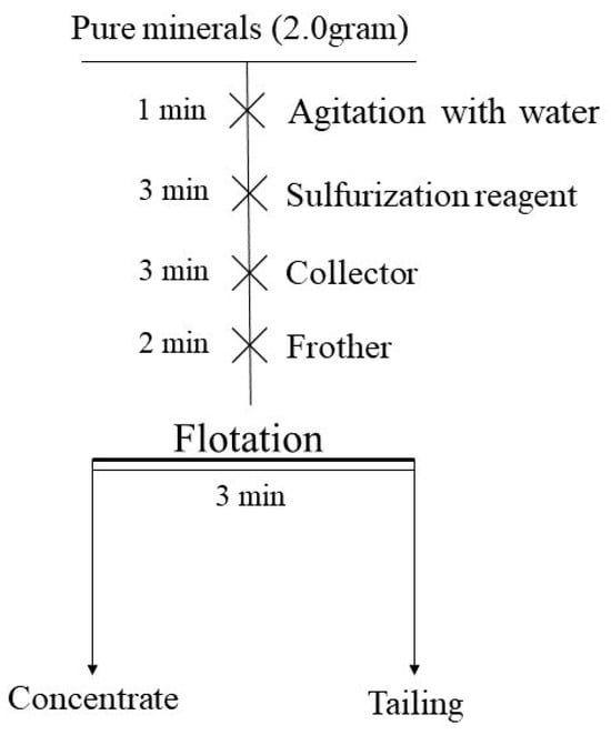 All micro-flotation experiments were carried out using an XFG series laboratory flotation machine (Jilin Exploration Equipment, Changchun, China) with a flotation cell (effective volume 40 mL). The spindle speed of the flotation machine was set at 1690 rpm. The micro-flotation procedure proceeded as follows: First, prior to each test, pure mineral particles (2 g) and distilled water (35 mL) were sequentially added into 40 mL plexiglass cells and stirred for one minute to prepare the slurry. In sulfidization flotation, Na2S∙9H2O was added as a sulfidizing agent and conditioned for 3 min. Next, one of the five thiol collectors and methyl isobutylcarbinol (MIBC) as a frother were added into the slurry in sequence, then conditioned for 3 min and 2 min, respectively. The time for froth collection was 3 min. The flowsheet of microflotation was presented in Figure 2. Finally, the concentrates and tailings were separately collected, dried and then weighted, and the malachite recovery was calculated using Equation (1). Each experiment was repeated three times and averaged.