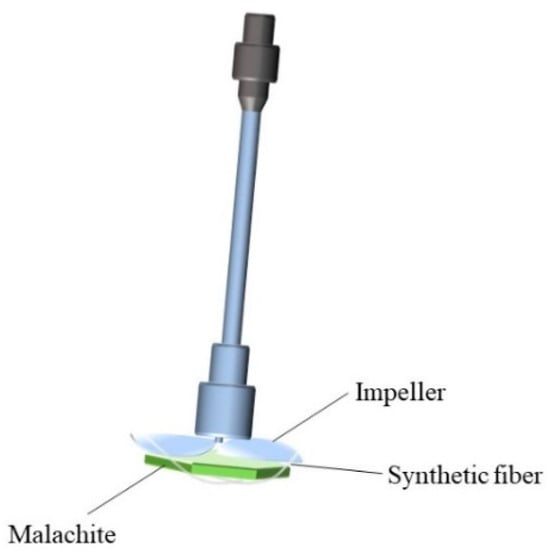 FTIR was used to determine the presence of the adsorption collector. The massive malachite (Φ 20 mm) was divided into two groups, with one group being treated with sulfidizing agent under conditions consistent with the sulfidization flotation tests while the other group was left untreated. The resulting massive malachite samples were fixed to the impeller of the flotation machine with synthetic fibers, as shown in Figure 3. The concentration of collector in the flotation cell was fixed at 150 mg/L, and the stirring time was kept the same as that of the micro-flotation test. The external force on the surface of the malachite was varied by changing the spindle speed of the flotation machine and by adding quartz to the flotation tanks; the FTIR spectra of the massive malachite samples were determined separately. The effect of external forces on the stability of the adsorption of the thiol collector on the malachite surface was determined by comparing the FTIR spectra of the individual massive malachite samples.