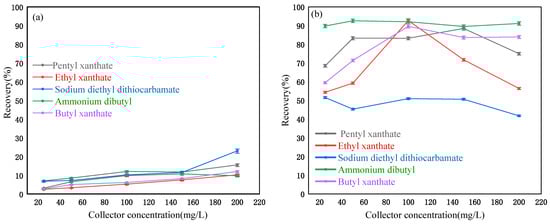Figure 4. The flotation recovery with different thiol collectors of: (a) Malachite flotation without sulfidization, (b) Sulfidized malachite.