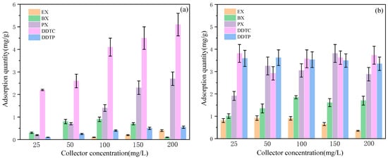 Figure 5. Adsorption amount of different thiol collectors on: (a) Malachite without sulfidization, (b) Sulfidized malachite.