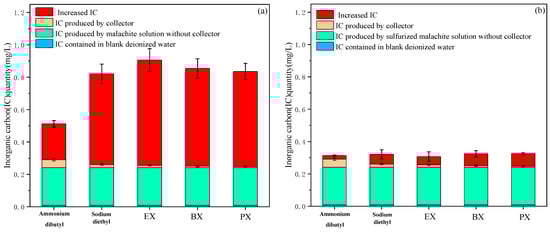 As illustrated in Figure 6a, after the interaction of malachite with five thiol collectors, the detected amount of inorganic carbon released into the solution was obviously higher than the total amount of inorganic carbon sourced from the DI water itself, the natural dissolution of malachite in the pure water environment, and the thoil collectors added to the flotation system. In other words, there was a macroscopic increase in the inorganic carbon in the solution after the reaction of malachite with the collector. The reason for this result might be that the presence of thiol collectors could induce the dissolution of malachite, leading to the acceleration of surface dissolution of malachite and the release of extra amounts of inorganic carbon, such as CO32−, HCO3, into the solution. This was considered to be an important aspect that could account for the poor flotation of malachite with thiol collectors in this study, i.e., the presence of thiol collector accelerated the surface dissolution of malachite, which made it difficult for the collectors to stably adsorb on the mineral surfaces or caused the adsorbed collectors to fall off from the mineral surfaces. In contrast, as shown in Figure 6b, the amount of inorganic carbon released into the solution was found to be much less than that of malachite without sulfidization when sulfidized malachite was treated with the thiol collectors. This suggests that sulfidization is capable of potentially inhibiting the induced dissolution of thiol collectors on the surface of malachite.