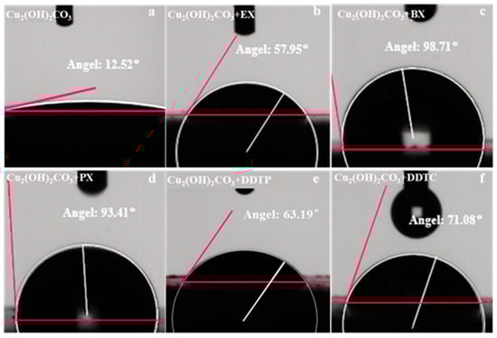 As shown in Figure 7a, the contact angle of malachite without flotation agent treatment was only 12.52°, indicating a strong hydrophilicity. As shown in Figure 7b–f, after reacting with five thiol collectors, the contact angle on the surface of malachite all increased significantly, indicating that the collector improved the hydrophobicity of malachite. This evidence supported the previous results of the adsorption amount measurements (i.e., the high contact angle of surface justified the sufficient adsorption amount of collectors). However, although the malachite surface tended to be hydrophobic under the action of thiol collectors, the flotation recovery was unsatisfactory (i.e., enough hydrophobicity did not return to a high recovery). The reason for the low recovery of flotation malachite might be that the surface dissolution of malachite induced by collectors resulted in the detachment of the collector adsorption layers, which led to the loss of hydrophobicity during the flotation. The effect of thiol collectors on the hydrophobicity and hydrophilicity of malachite is shown in Figure 7.