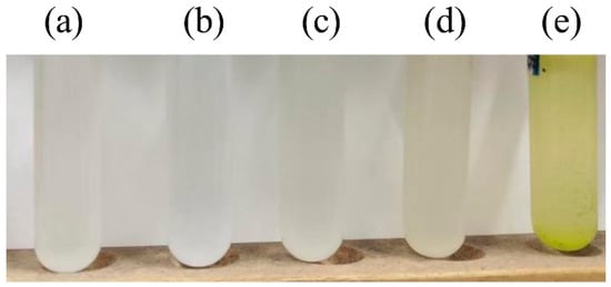 Figure 8. The procedure of solubility test: (a) Butyl xanthate, (b) Filtrate of malachite after stirring (c) Add butyl xanthate to the filtrate of malachite (d) Add the filtrate of malachite to butyl xanthate (e) Add malachite powder to butyl xanthate.