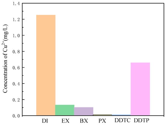 Above, the inorganic carbon measurement and solubility test were used to analyze the dissolution of the malachite surface. It is known that malachite surface dissolution can release copper ions. Therefore, this section focuses on the amount of copper ions released by malachite stirred in DI water and the aqueous flotation system with thiol collector. The concentration of copper ions in the stirred supernatant of malachite with DI water and thiol collectors was determined by ICP-OES analysis. As shown in Figure 9, the highest concentration of copper ions released from malachite after stirring in pure water was only 1.2 mg/L, which was not enough to consume a large amount of collector. The concentration of copper ions released from malachite in the collectors solution was lower than those released in DI water due to the reaction of copper ions with the collector to form a precipitate. The smaller the solubility product (Ksp) of copper-xanthate precipitate, the easier the precipitation, i.e., the smaller the concentration of copper ions in the supernatant. The solubility product (Ksp) of copper-xanthate precipitate is shown in Table 1.