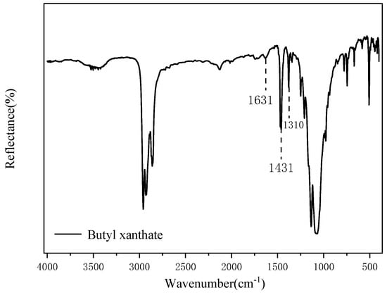 In order to further investigate the stability of the adsorption of the thiol collector on the malachite surface, a FTIR analysis was carried out, and the results are shown in Figure 10 and Figure 11. In the Infrared spectrogram of butyl xanthate shown in Figure 10, the asymmetric stretching vibration of C–O–C is observed at 1310 cm−1. The methylene group has a deformation vibrational absorption peak at 1431 cm−1. The vibrational absorption peak of C–O=S is at 1631 cm−1.