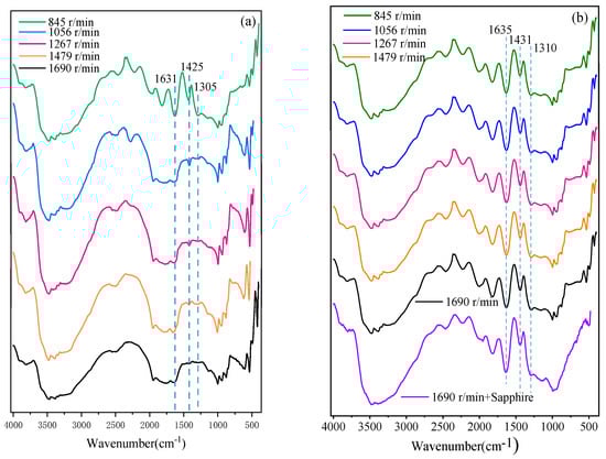 Figure 11a shows the FTIR spectra of massive malachite after interaction with butyl xanthate at different spindle speeds of the flotation machine. From the figure, it can be established that the infrared spectra of the massive malachite samples showed absorption peaks at 1304 cm−1, 1425 cm−1 and 1631 cm−1 when the spindle speed of the flotation machine spindle was 845 r/min, indicating that butyl xanthate was adsorbed on the surface of the malachite. When the spindle speed of the flotation machine was increased to 1056 r/min, the absorption peaks at 1031 cm−1 and 1035 cm−1 had disappeared, and the absorption peak at 1425 cm−1 was still present, although its intensity had diminished. With the gradual increase in the spindle speed, the intensity of the absorption peak at 1425 cm−1 became weaker and weaker. When the spindle speed reached 1690 r/min, the characteristic peaks of butyl xanthate were hardly observed on the surface of the massive malachite. This result indicates that the xanthate collector is able to adsorb on the surface of malachite, but the adsorption is not stable, and the adsorbed layer of the collector falls off when there is an external force (for example, in an agitated fluid environment). The contradiction between the results of the previous contact angle test and the micro-flotation test is also well explained by this result. In the contact angle test, since the external force on malachite is small, the collector can still be adsorbed more firmly on the surface of the mineral, resulting in a large contact angle. However, during the micro-flotation test, the spindle speed of the flotation machine was too fast, and the fluid force on the malachite surface was sufficient to dislodge the poorly adsorbed collector, resulting in low flotation recoveries of malachite despite a large amount of collector being consumed.