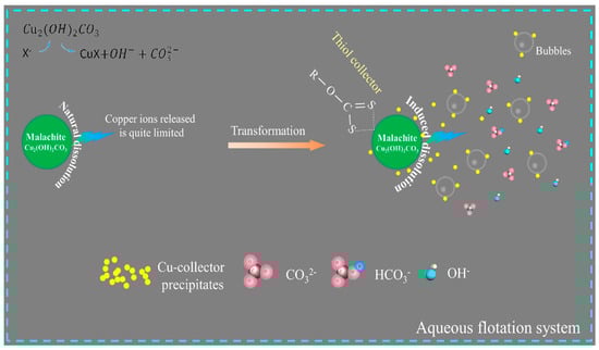 Copper is widely used in power transmission, air conditioning refrigeration, transportation, electronics, construction and other industries, and it has also proven to be an indispensable base metal in the national industrial system [1,2,3,4]. By 2025, global copper demand will rise to around 29 million tonnes, of which 83.5% will be used in renewable energy industries such as wind power and energy storage [5,6]. Therefore, the stable supply of copper resources has aroused widespread concerns [6,7,8,9]. Copper sulfide minerals and copper oxide minerals are two major copper-bearing resources in natural deposits [10,11]. Generally speaking, copper sulfide minerals exhibit good floatability with thiol collector, as their inherent surfaces properties allow them to easily interact with thiol collectors, forming hydrophobic complexes on mineral surfaces [12,13]. However, copper oxide minerals, unlike copper sulfide minerals, are generally characterized by non-conductivity, so they do not respond efficiently to thiol collectors in flotation [14,15,16,17]. Malachite (Cu2(OH)2CO3) is one of the most common copper oxide minerals, and numerous investigations have indicated that it was difficult to achieve efficient recovery of malachite by flotation without sulfidization using thiol collectors [18,19], but such a procedure, featuring the sulfidization of malachite before flotation, was feasible to remarkably promote the flotation recovery of malachite with thiol collectors [20,21,22,23]. It was reported that there were various reasons accounting for the drawback of malachite flotation without sulfidization: (1) the adsorption layer of thiol collectors on the malachite surface is unstable [24,25], which some researchers believe is because the stability index of the thiol collector’s adsorption layer on the surface of malachite is too low [26,27]; (2) malachite is prone to metal ion dissolution, meaning that the collector will react with the metal ions in solution, resulting in a high collector dosage requirement [26,28,29]; (3) the portion of ionic bonding in the crystal lattice of malachite is high, leading to the establishment of a stronger hydrated shell [30]; (4) copper oxide minerals often exhibit a metal-deficient surface in pulp due to their high solubility, which is detrimental to xanthate adsorption [31,32].