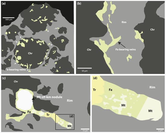Schematic representation of backscattered electron (BSE) images of representative CV3 Vigarano chondrite. (a) Schematic reconstruction illustrating the occurrence of Fayalite (Fa) as veins and a lacy network surrounding the chondrules in the CV3 Vigarano chondrites (white arrows) (reconstruction of Figure 1 in []). (b) Fayalite bearing veins crosscut rims in the space between two chondrules. (c) A vein composed of fayalite (Fa), troilite (Tr), and magnetite (Mt) emerges from a magnetite–sulfide–kamacite (mt-slf-km) nodule. (d) A part of (c) between large troilite and magnetite grains, small fayalite grains coexist with irregularly shaped magnetites ((b–d) are modified from Figure 2 in []).