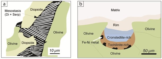 Schematic representations of petrographical features observed in the QUE97990 chondrite []. (a) Chondrule mesostasis is formed of dense arrays of parallel lath-shaped crystallites of diopside regularly alternating with serpentine (modified from Figure 1 in []). Such a petrographical feature could be a symplectite. (b) Embayment in chondrules exhibiting zoned mineral deposits (modified from Figure 2c in []). The embayment could be inherited from the initial shape of the chondrule. The zoned deposit could be formed by thermal metamorphism.