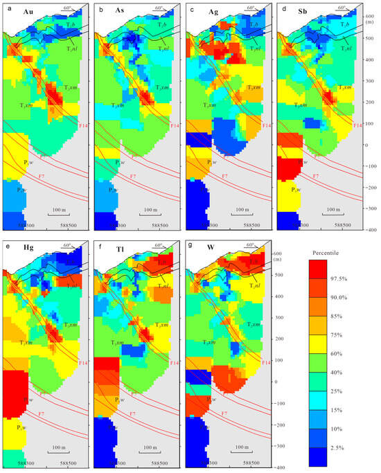 In Figure 4a, areas with high Au content (≥75%, orange to deep red) were mainly located in the F14 fault, corresponding to strong Au mineralization (Figure 2c). Analogously, rocks containing Au content ranging from 11.5 to 39.8 ng/g (60%–75%, yellow), indicative of weak Au mineralization, were found distributed within or along the periphery of the F14 and F7 faults. The spatial distributions of As, Ag, Sb, Hg, Tl, and W (Figure 4b–g) were comparable to those of Au, although some significant differences existed. The F7 faults and their vicinity demonstrated intense Sb, Hg, Tl, and W anomalies (orange to deep red). Additionally, local positions in the Xuman and Bianyang formations above the F14 fault also showed high contents of Ag, Hg, Tl, and W (Figure 4c–g). Other elements displayed markedly different spatial distributions than Au (Figure 4h–o). Areas with high contents of Bi, Co, Cu, Ni, Pb, and Zn were primarily distributed outside the F14 fault in the Xuman, Niluo, and Bianyang formations. However, Cd (Figure 4i) and Mo (Figure 4l) mainly displayed intense anomalies in the Wujiaping Formation and the nearby Xuman Formation, particularly within and at the periphery of the F7 fault.