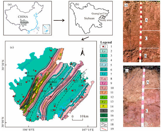 (a) The geographical position of the Sichuan Province in China; (b) a map of Guang’an City; (c) sampling and geological map; (d,e) typical purple profiles of A-C-R and A-C types. 1: Sampling sites. 2: Suining Fm. 3: Shangshaximiao Fm. 4: Xiaximiao Fm. 5: Xintiangou Fm. 6: Ziliujing Fm. 7: Zhenzhuchong Fm. 8: Xujiahe Fm. 9: Leikoupo Fm. 10: Jialingjiang Fm. 11: Feixianguan Fm. 12: Changxing Fm. 13: Longtan Fm. 14: Lower Permian Series. 15: Lower Silurian Series. 16: Lower Ordovician Series. 17: Emeishan basalt. 18: Major fold axis trace. 19: Major fault (this figure is modified from the literature [40]).