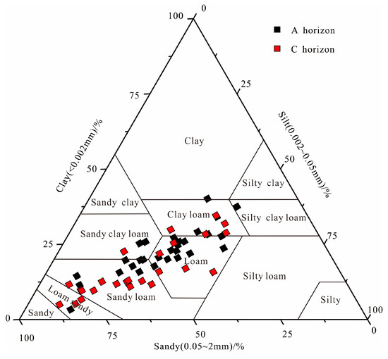 Based on the international soil texture classification [57], the soil in the study area was primarily classified as loam or sandy loam (Figure 2). In the soil’s A horizon, the sand, silt, and clay contents varied from 18.8% to 83.6%, 9.3% to 46.8%, and 3.3% to 40.1%, with average values of 47.4%, 29.9%, and 22.7%, respectively. Meanwhile, in the soil’s C horizon, the quantities of sand, silt, and clay ranged from 25.3% to 86.2%, 8.5% to 47.9%, and 4.8% to 34.3%, with average values of 57.3%, 26.4%, and 16.3%, respectively. The A horizon displayed a higher composition of clay or silt and a lower composition of sand compared to the C horizon, inconsistent with the typical results of soil sedimentation processes. This irregularity may be ascribed to the weathering of the purple soil from red beds of sandstone and mudstone interbedded with a relatively short period of soil formation, without any apparent mechanical depositional processes [58].