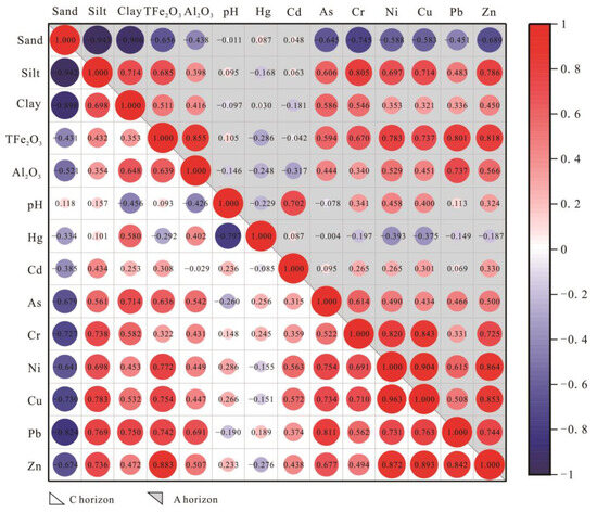 The heavy metals, except for Cd and Hg, showed a positive correlation with the concentrations of soil silt, clay, Fe, and Al, and a negative correlation with the soil sand content. The results suggested that heavy metals, such as As, Zn, Cr, Ni, Pb, and Cu, were easily adsorbed by fines, clay particles, or Fe- and Al-containing minerals. Soil texture and major components were significant factors affecting the concentration of heavy metals in soil [15]. However, Cd or Hg in the soil exhibited a relatively significant correlation with silt, clay, and Al2O3 only in the C horizon, which may indicate artificial input or mixed sources for these elements. In the soil horizons A and C, the correlation coefficients between Hg and pH were −0.229 and −0.797, respectively. In contrast, Cd displayed a positive correlation with pH, with correlation coefficients displaying 0.702 and 0.236 in soil horizons A and C, respectively. Other heavy metal elements showed weak to moderate positive correlations with soil pH, with correlation coefficients ranging from 0.148 to 0.458. An increase in soil pH typically enhances the negative charges on the surfaces of clay minerals and organic matter, encouraging a transition in electrostatic absorption towards specialized absorption. The latter absorption boasts stronger binding forces, resulting in the accumulation of heavy metals in the soil [5]. However, the geochemical behavior of Hg in soil is relatively complex. Several studies have shown that increased pH levels lead to the formation of Hg(OH)x(2−x) hydroxyl complexes with soil OH, thereby enhancing mercury mobility and introducing a negative correlation between soil Hg and pH [59].