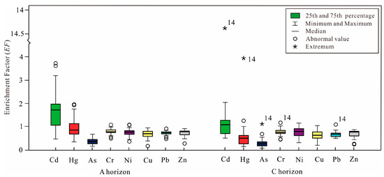 Similarly, the concentrations of As, Cr, Cu, Ni, Pb, and Zn in the C horizon were in an uncontaminated state, with the average EF values of 0.8, 0.8, 0.6, 0.7, 0.6, and 0.3, respectively. For the Cd concentration in the C horizon, one sample was heavily polluted, one sample was moderately polluted, 44% of the samples were lightly contaminated, and 48% were uncontaminated. For the Hg concentration in the C horizon, 11% was under conditions of moderate to slight pollution, while the remaining percentage was uncontaminated. The high EF values of Hg and Cd in the investigated soils, especially in the top soils, may be related to the development of metallic mineral resources and agricultural activities [60,61]. In addition, other heavy metals with EF less than 1 suggest that the pure migration of these elements in the area might have occurred during rock weathering and soil formation. An extremum in the C horizon, showing moderate or heavy contamination, may be related to the presence of ferromanganese nodules within it [59].