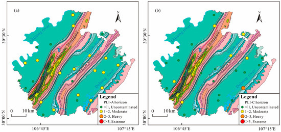 Scatter plot of soil heavy metal PLI evaluation in the study area: (a) in A horizon; (b) in C horizon. (The stratigraphic legend is consistent with Figure 1).