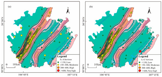 Scatter plot of soil heavy metal IRI evaluation in the study area: (a) in A horizon; (b) in C horizon. (The stratigraphic legend is consistent with Figure 1).