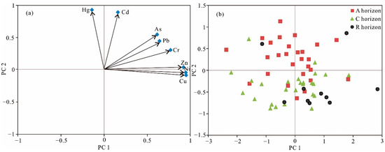 The loadings of the sample points in the PCA figure (Figure 7b) displayed that the soil samples from the A horizon were closer to PC2. Conversely, the soil samples from the parent rock horizon (R horizon) exhibited more proximity to PC1. This pattern further indicated anthropogenic sources of heavy metals, including Cd and Hg, were primarily occurring in the topsoil of the study area.