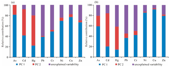 A factor analysis was employed to have a clear understanding of the origins of soil heavy metals in the study region (Figure 7a,b). Before conducting the factor analysis, the soil element contents successfully passed the Kaiser–Meyer–Olkin (KMO) measurement test with a value of 0.809 and Bartlett’s sphericity test at a significance level of p < 0.05 [17]. These results indicated that the elements were highly correlated and appropriate for principal component analysis. After the varimax orthogonal rotation of Kaiser standardized data, two main component factors were identified with initial eigenvalues exceeding 1. The two main principal components (PCs) contributed 50.53% and 27.77% of contributions, respectively, with a cumulative contribution rate of 78.30% (Table 4), explaining the majority of information on soil heavy metals in the research area. The elements Cr, Cu, Ni, and Zn have strong loadings (>0.75) on PC1, while Pb and As have medium loadings (0.5~0.75) on PC1 (Table 4, Figure 7a). The contents of these elements had a strong positive correlation with each other, indicating a possible shared origin. The heavy metals with high loadings in PC1 mostly had enrichment factors (EFs) less than 1, suggesting that natural factors, including the erosion and weathering of the matrices, were primarily responsible for contributing to PC1.