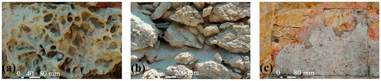 Degradation forms of the Calcari di Cagliari limestones: (a) alveolization of the Pietra Cantone; (b) loss of material and pulverization in a wall built with Tramezzario ashlars; (c) detachment and oxidation in a Pietra Forte ashlar.
