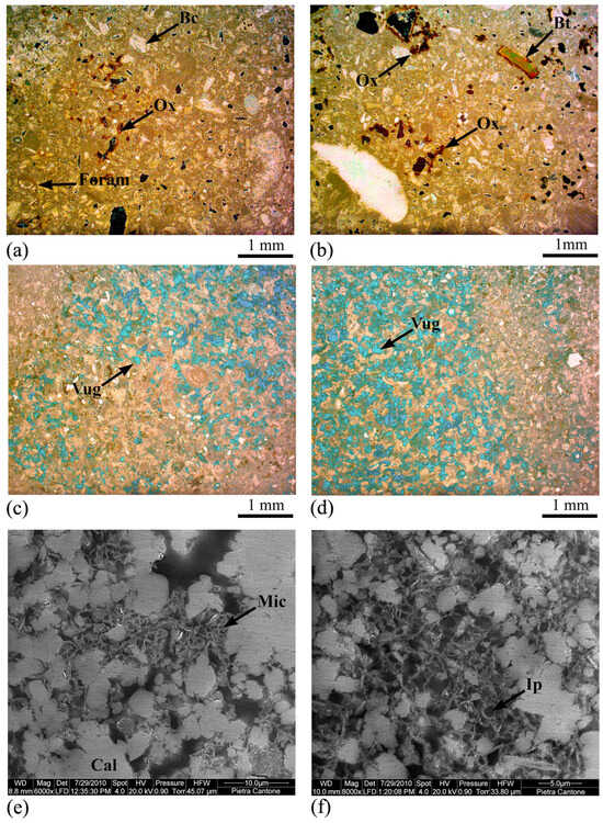 Textural characteristics of Pietra Cantone: (a) Mud-supported texture with bioclasts (Bc), foraminifera (Foram) and iron oxide (Ox); OM cross polarized light. (b) Iron oxide (Ox) and biotite (Bt) crystal; OM cross polarized light. (c) Vug secondary porosity (Vug); OM plane polarized light. (d) Vug secondary porosity (Vug) in a particularly porous sector of the rock; OM plane polarized light. (e) Micrite (Mic) microcrystals and calcite (Cal); SEM image. (f) Interparticle microporosity (Ip) in the microcrystalline carbonate mud; SEM image.