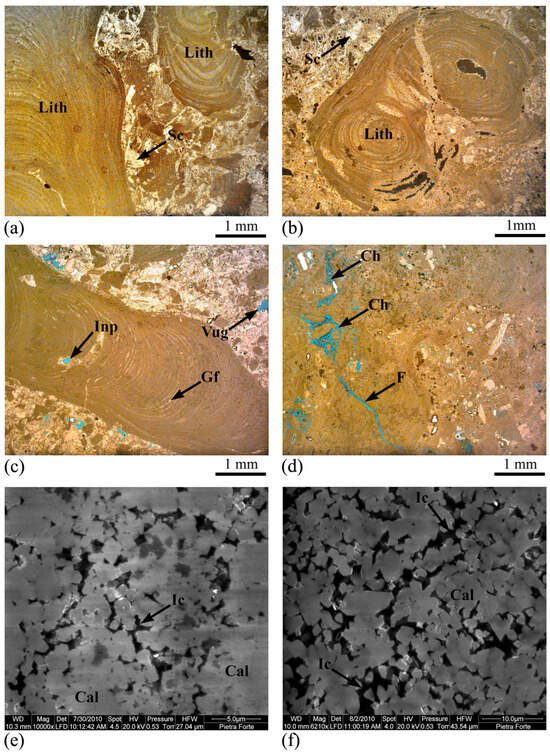 Textural characteristics of Tramezzario: (a) Grain-supported texture with bioclasts of Lithothamnium algae (Lith); OM cross polarized light. (b) Sparry calcite (Sc) among the bioclasts of Lithothamnium algae (Lith); OM cross polarized light. (c) Vug, moldic (Mold) and intraparticle (Inp) secondary porosity; OM plane polarized light. (d) Channel (Ch) and fracture (F) secondary porosity; OM plane polarized light. (e) Intercrystal (Ic) pores among the calcite (Cal) crystals; SEM image. (f) Vug and intercrystal (Ic) porosities and calcite (Cal); SEM image.