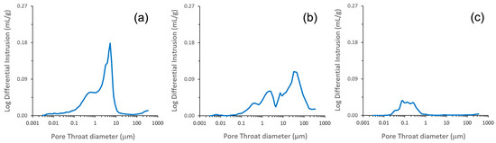 MIP curves highlighting the pore-throat size distributions of three representative samples of the Calcari di Cagliari: (a) Pietra Cantone; (b) Tramezzario; (c) Pietra Forte.