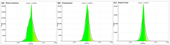 To account for the accuracy of the HR 3D models computed with the CRP methodology, we first estimated the geometrical anomalies of the point clouds of the Pietra Cantone, Tramezzario and Pietra Forte prismatic-shaped samples with the aid of the RANSAC shape detector utility of CloudCompare. Six planes fitted to the faces of each sample were automatically computed and then meshed. The residuals of the point cloud with respect to the planes using the corresponding meshes as references were computed with the “cloud to mesh” distance (C2M) function of the package. After aggregating the six faces’ geometrical anomalies with the merge function of CloudCompare, the statistical Gauss function was subsequently applied in order to estimate the standard deviation of the means of the geometrical anomaly aggregated clouds of the three samples [74]. The results of this last computation are represented in the three histograms of Figure 7.
