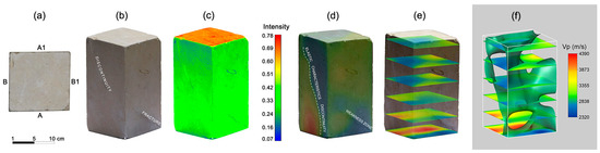 Results of the 3D analyses by the integrated approach for the Pietra Forte sample. (a) Localization of the different faces of the sample. (b) 3D HR CRP model texturized with natural colors and represented with an RGB scale. (c) 3D HR CRP model texturized with the intensity of ambient light. (d) 3D ultrasonic tomography incorporated within the 3D HR CRP model. (e) Tomography horizontal slices. (f) Isosurface of 5200 m/s with horizontal slices.