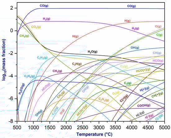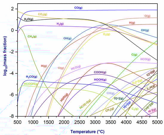 The carbon ions (C− and C+) were a byproduct of the CH4 breakdown [35]. The log10(mass fraction) of the CO2/CH4 plasma mixture (molar ratio 2:1) at equilibrium is shown as a function of temperature in Figure 5.