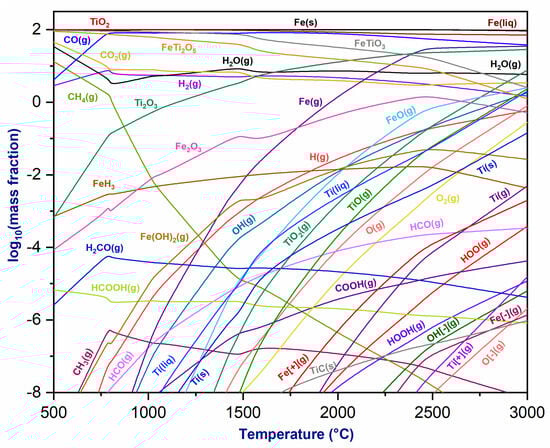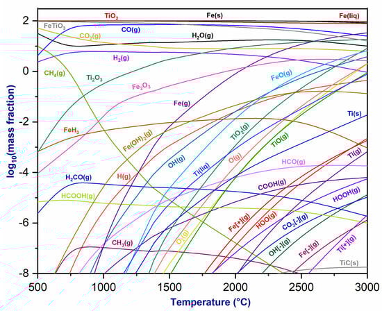 Figure 6 shows the equilibrium log10(mass fraction) of the CO2/CH4 plasma mixture and FeTiO3 as a function of temperature. The production of iron metal Fe(s) starts above 500 °C and remains stable before producing Fe(liq). Similarly, TiO2 is produced at this range. Likewise, the ilmenite (FeTiO3) phase is stable, and its mass fraction decreases by increasing the temperature, whereas Ti2O3 and Fe2O3 appear at low temperatures, and their mass fractions increase with increasing temperature. Moreover, Ti(s) and Ti(liq) are produced at over 900 °C, and their amounts increase until the temperature reaches 3000 °C. Fe(g) and Ti(g) originally evolved at temperatures of around 800 °C and 1700 °C, respectively.