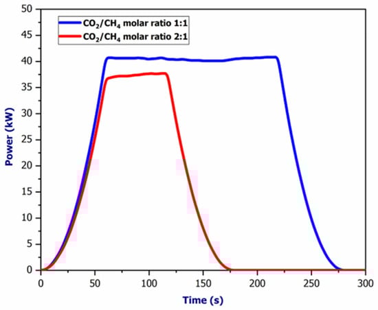 Power variation over time for CO2/CH4 molar ratio of 1:1 and 2:1 at a current of 252 A.