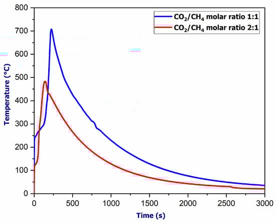 The temperature inside the reactor bulk increases rapidly to reach more than 700 °C by using the CO2/CH4 molar ratio of 1:1, and after that, it decreases after 500 s. As for the molar ratio of 2:1, it did not exceed 500 °C. Figure 9 shows the variation of the temperature as a function of time. The temperature variation is divided into two different parts: the heating part and the cooling part. The DC plasma torches working with a gas mixture of CO2 and CH4 generate high enthalpies (50 MJ/kg). The plasma enthalpy reveals a system’s heat content. As a result, the thermodynamic property of the plasma arc is affected by particle density, plasma gases, and ionization degree [36]. As a result, the presence of a high electron density makes the environment more energetic and reactive, allowing the arc plasma to create a rich region for chemical species activation [37].