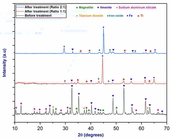 The X-ray diffractogram of feed material before and after thermal plasma treatment is shown in Figure 11. The primary constituents of the raw material are ilmenite (FeTiO3), magnetite (Fe3O4), titanium dioxide (TiO2), and sodium aluminum silicate (Na6Al6Si10O32). Using a plasma torch working with CO2 and CH4, ilmenite concentrate has been reduced to iron metal (Fe) and titanium (Ti), besides the ilmenite phase (FeTiO3) and iron oxide (FeO). The XRD patterns show that the ilmenite concentrate has been reduced using two molar ratios of 1:1 and 2:1, indicating that the CO2/CH4 DC torch will be a novel and efficient technology in mineral processing and material extraction. As a result, the plasma treatment may separate titanium from iron metal, potentially increasing purification over traditional methods used in metallurgy extractives [38].