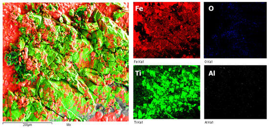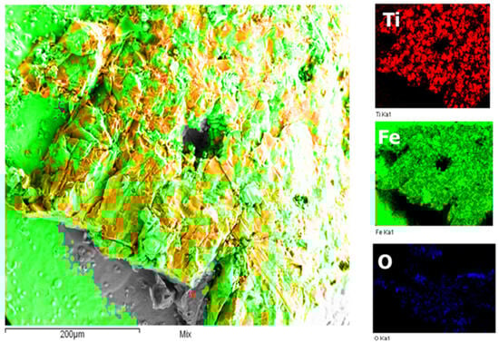 The SEM image of the ilmenite concentrate before and after plasma treatment is shown in Figure 12. As a result, the analysis reveals a clean and smooth surface of natural ilmenite concentrate before plasma treatment. However, after thermal treatment for both molar ratios (2:1 and 1:1), a melted surface was observed, resulting in two distinct regions (titanium area and iron area) [40]. Iron, titanium, oxygen, silicon, aluminum, and vanadium make up the bulk of the ilmenite concentrate, as shown in Figure 13, which displays the phase distribution of ilmenite prior to thermal treatment. Oxygen is found in high concentrations due to the existence of many oxides in raw materials like TiO2. After plasma treatment, a phase composed entirely of titanium emerges, surrounded by a second metal phase composed of iron. Figure 14 and Figure 15 show that the amount of oxygen has been reduced.