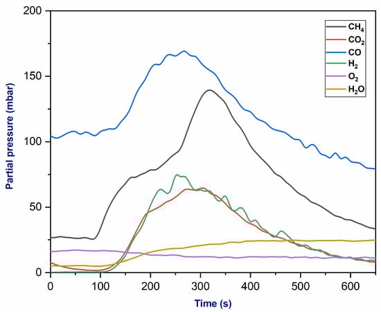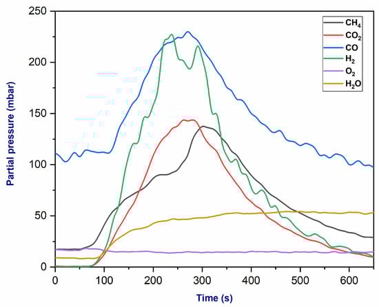 which causes the CO2 level to decrease as the temperature within the plasma reactor increases [29]. As a result, the CH4 quantity is critical, and increasing it causes the plasma torch to have more reduction power. It is important to note that the gases released would have a composition determined by the plasma, its reactions, and the desired outcomes. Depending on the conditions under which the plasma combination was created and the outcome of the reaction, other gases may be released. Figure 16 and Figure 17 show the analysis of the partial pressure of output gases using both molar ratios 1:1 and 2:1, respectively. Thus, a 1:1 molar ratio promotes the formation of CO at the reactor exit, but a 2:1 ratio promotes the formation of both CO and H2. The fact that O2 is not injected directly into the reactor implies that it comes in from the outside air. This observation is expected, considering that the reactor is not hermetically sealed and runs at pressures close to one atmosphere. It is important to note that the material was heated in an oven at 105 °C for 24 h before the experiment, which explains the low quantity of H2O. This demonstrates that plasma produces H2O. On the other hand, O2 works as an oxidizer, converting CO to CO2 and H2 to H2O. This explains why the CO2 levels are higher while the plasma is active.