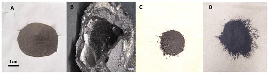 Image of ilmenite concentrates from different parts of the setup: (A) raw material; (B) cone part; (C) powder part; (D) filter part.