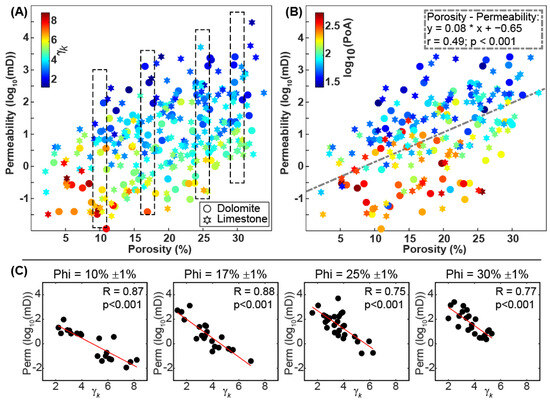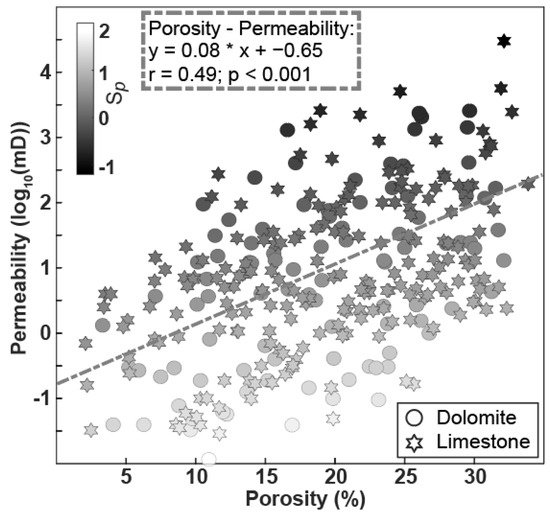 - Fabricius, I.L.; Baechle, G.; Eberli, G.P.; Weger, R. Estimation of permeability of carbonate rocks from porosity and vP/vS data by applying Kozeny’s equation. In Challenges in Seismic Rock Physics: Summer Workshop, June 25–29, Beijing 2007; RIPED, PetroChina, University of Houston & Colorado School of Mines: Beijing, China, 2007. [Google Scholar]