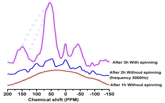 After 2 h, the analysis was performed with spinning at a frequency of 5000 Hz, resulting in peaks with low intensity. This low intensity of the peaks after spinning could have been due to several factors, including poor spinning stability, limited spectral resolution, or low signal-to-noise ratio.
