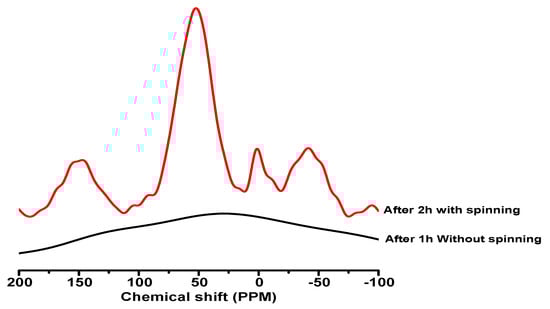 The samples were analyzed without spinning after 10 min, but no NMR signal was obtained. This could be due to a number of factors, such as the sample being too inhomogeneous or the sample being too small to generate a measurable NMR signal. However, after 1 h of preparation, a broad signal was obtained, where we could not clearly identify the different environments present at the time; the paste contained many contributions of aluminum species formation, which we could not identify without spinning the sample.