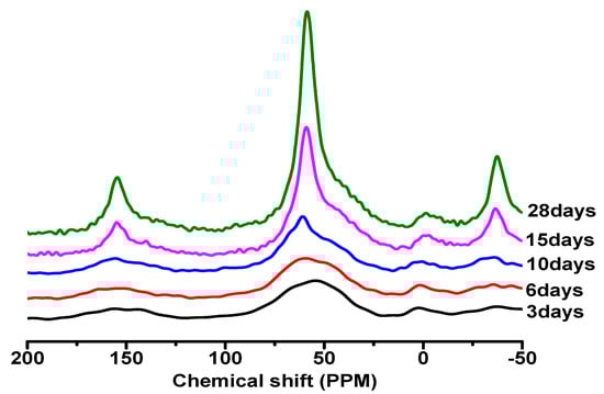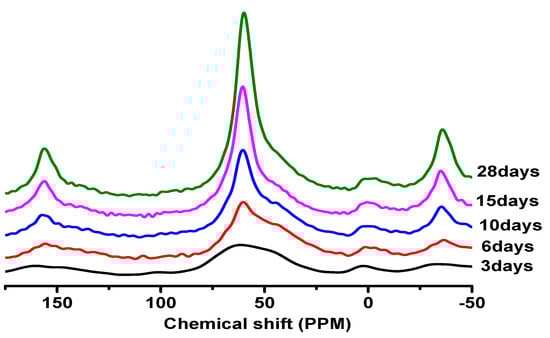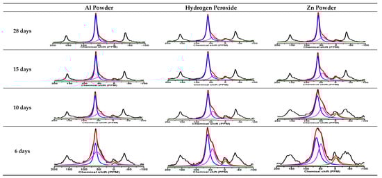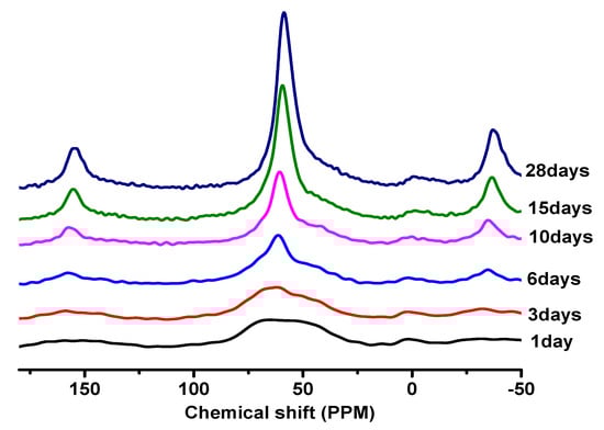 The 27Al MAS-NMR spectra of the geopolymer foam samples changed with time as the geopolymerization reaction progressed. It is relevant to note that peaks on the 27Al MAS-NMR spectra were poorly defined and the resolution did not change significantly at 1, 3, and 6 days, because the sample was not well hardened and the geopolymerization reaction was still ongoing [12]. However, after 10, 15, and 28 days, NMR patterns of the three geopolymer foam samples now contained more defined components. The first component was centered at +57 ppm and was related to tetrahedral aluminum [37], while the second one was smaller and centered at +1 ppm, so it was attributed to octahedral aluminum. This suggests that the structure and distribution of aluminum species in the samples changes as the geopolymerization reaction progresses.