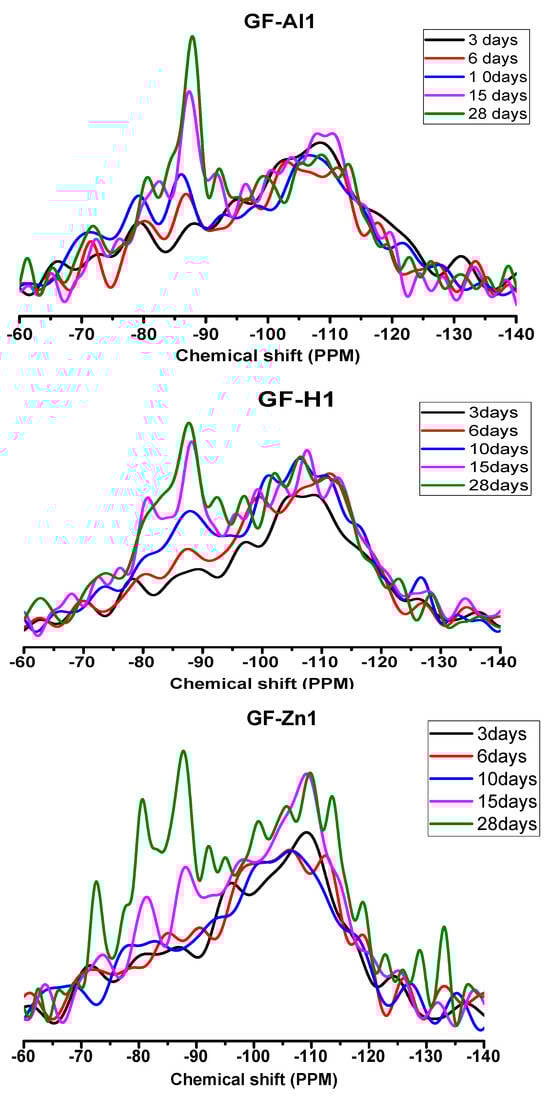 After 15 days of reaction, the peak assigned to Q2 at −86 ppm was more intense in GF-Al1 and GF-H1 compared to GF-Z1, suggesting a higher degree of polymerization and ordering in GF-Al1 [26] and GF-H1 samples. The continuous change over 28 days found suggests that the time for the completion of silicate condensation may be very long.