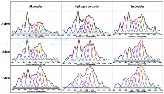 The 29Si MAS-NMR spectra of GF-Al1, GF-H1, and GF-Zn1 geopolymer foam samples are presented in Figure 8 and Figure 9, and results are summarized in Table 4. The spectra of the three samples show broad and poorly resolved bands at the early stages of the reaction, due to short reaction times and unreacted FA, indicating a high degree of disorder. The broad peak observed was in the chemical shift range of −70 to −120 ppm, which is a characteristic feature of both aluminosilicates and silica gels [39]. However, as the reaction time increases, the intense peaks shift towards higher chemical shifts, indicating the ongoing geopolymerization reaction of the geopolymeric foams [40]. The principal reaction product in all analyzed geopolymer foam samples is an alkali aluminosilicate gel [41]. The spectra have been deconvoluted to identify the various Qn species, which provide information about the degree of polymerization and the ordering of the geopolymer foam [12].