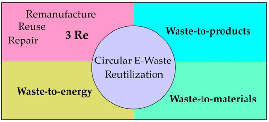 To varying degrees, repair, reuse, and remanufacturing involve the recovery of used electronic parts to make new products. Material transformation is the process of converting residual solid waste, such as WEEE, into different materials or products using physical, chemical, microbiological, or other methods once 3Re and high-value resources have been extracted. The process of energy recovery involves burning combustible materials to produce heat energy [9].